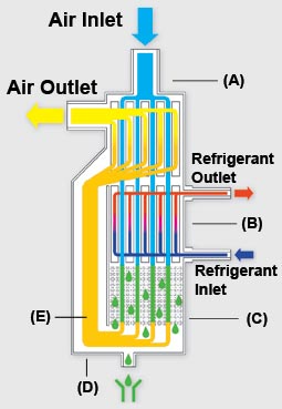 (A) - The counter flow arrangement to the air passages within the air/air heat exchanger ensures maximum heat transfer efficiency providing superior performance.(B) -The generous size of the air/refrigerant heat exchanger along with the further employment of counter flow techniques to the gas flow stream allows for a complete and efficient evaporation of the refrigerant ensuring that no liquid can be returned to the refrigeration compressor improving efficiency and reliability still further.(C) - The high efficiency condensate separator is located in the perfect position at the bottom of the vertical heat exchanger arrangement. The separator labyrinth is generously sized and employs coalescence in order to achieve a high degree of moisture separation.(D) - The generously sized separator allows for the correct functioning of the dryer in situations of extreme humidity.(E) - The larger cross sectional area of the flow channels within the heat exchanger reduces the velocity of the compressed air flow, resulting in a much lower pressure drop and subsequently lowers power consumption.